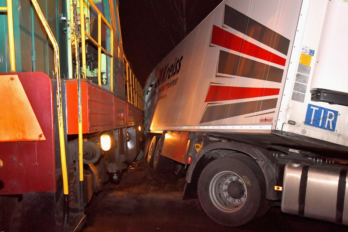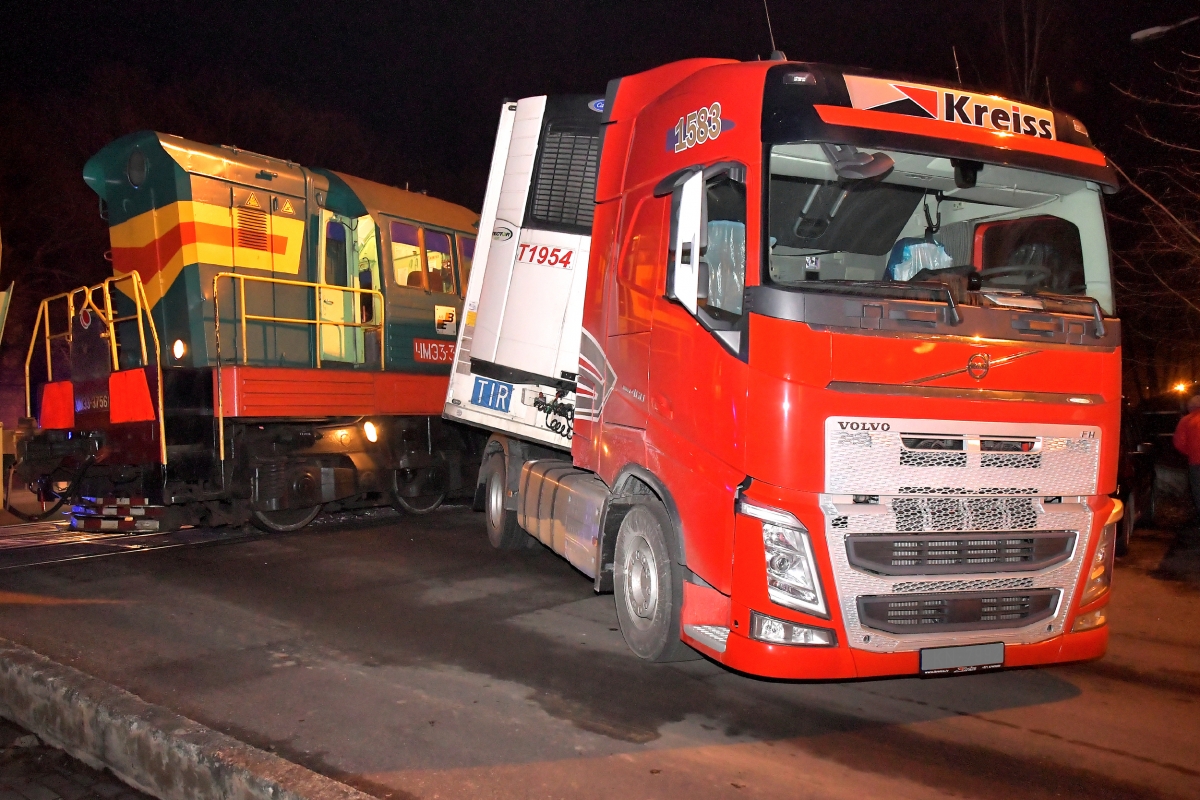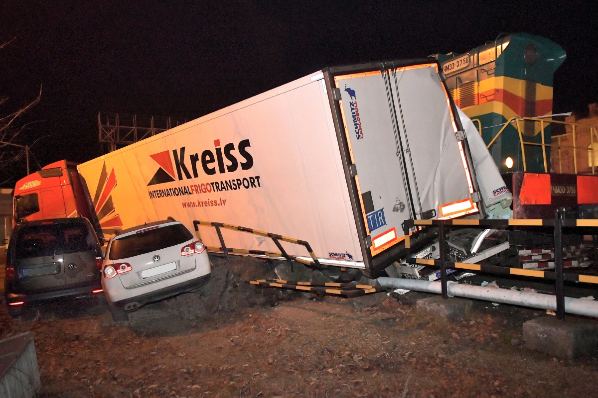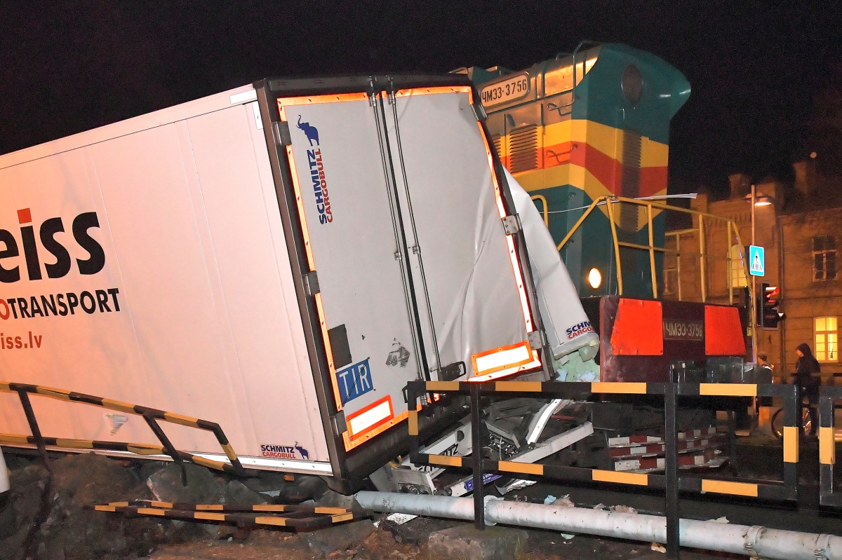 Столкновение грузовика и поезда на ул. Дзинтару. Фото: Айвар Кестерис.