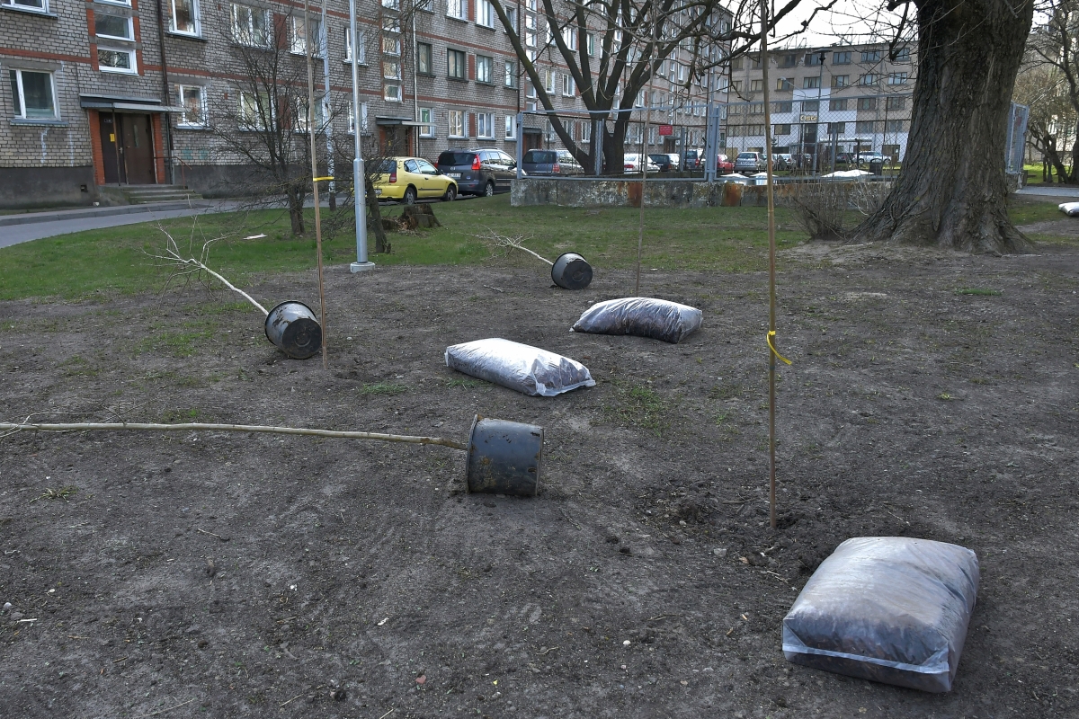 Посадка деревьев на ул. Дзинтару. Фото: Айвар Кестерис.