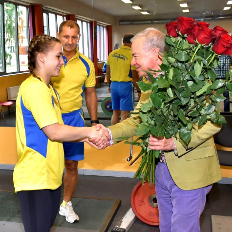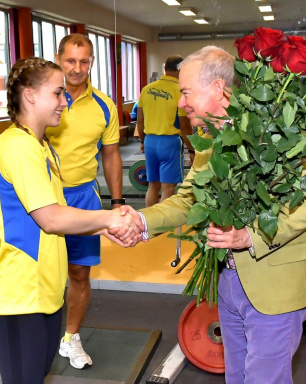 Председатель думы А. Лемберг поздравляет чемпионку мира Ребеку Коху. Фото: Айварс Кестерис
