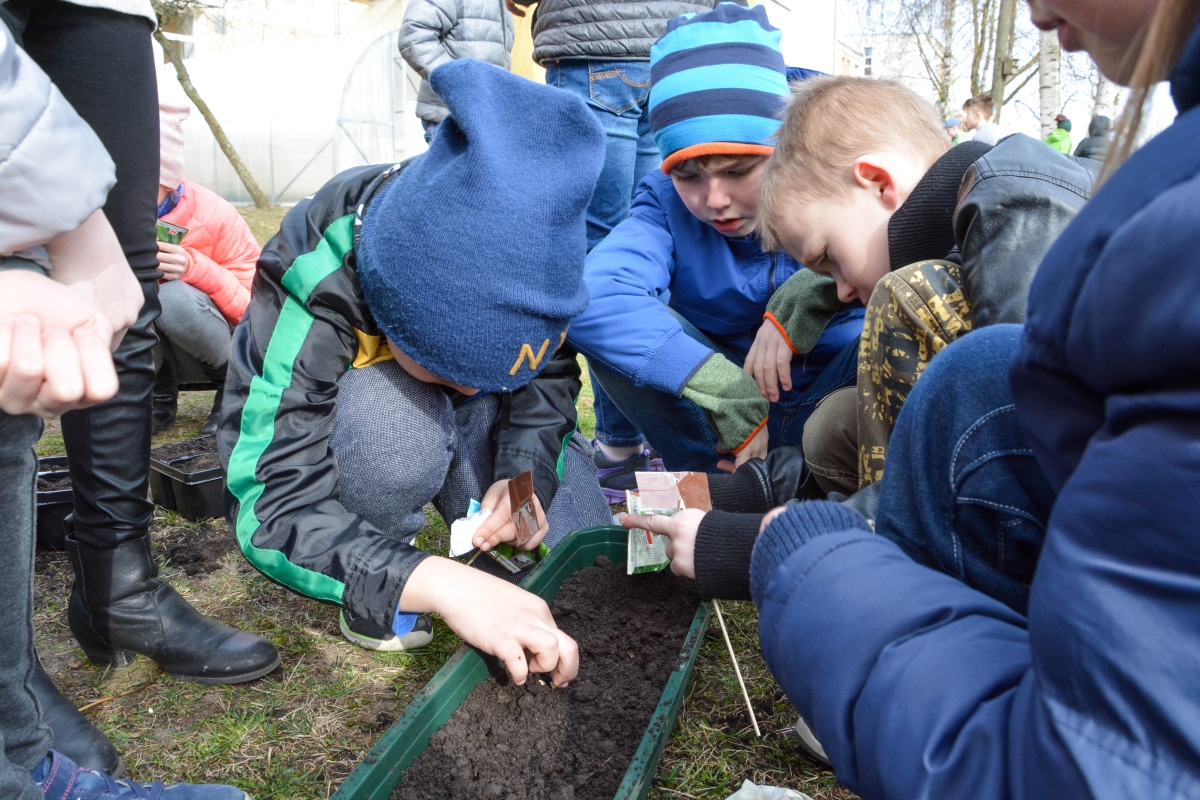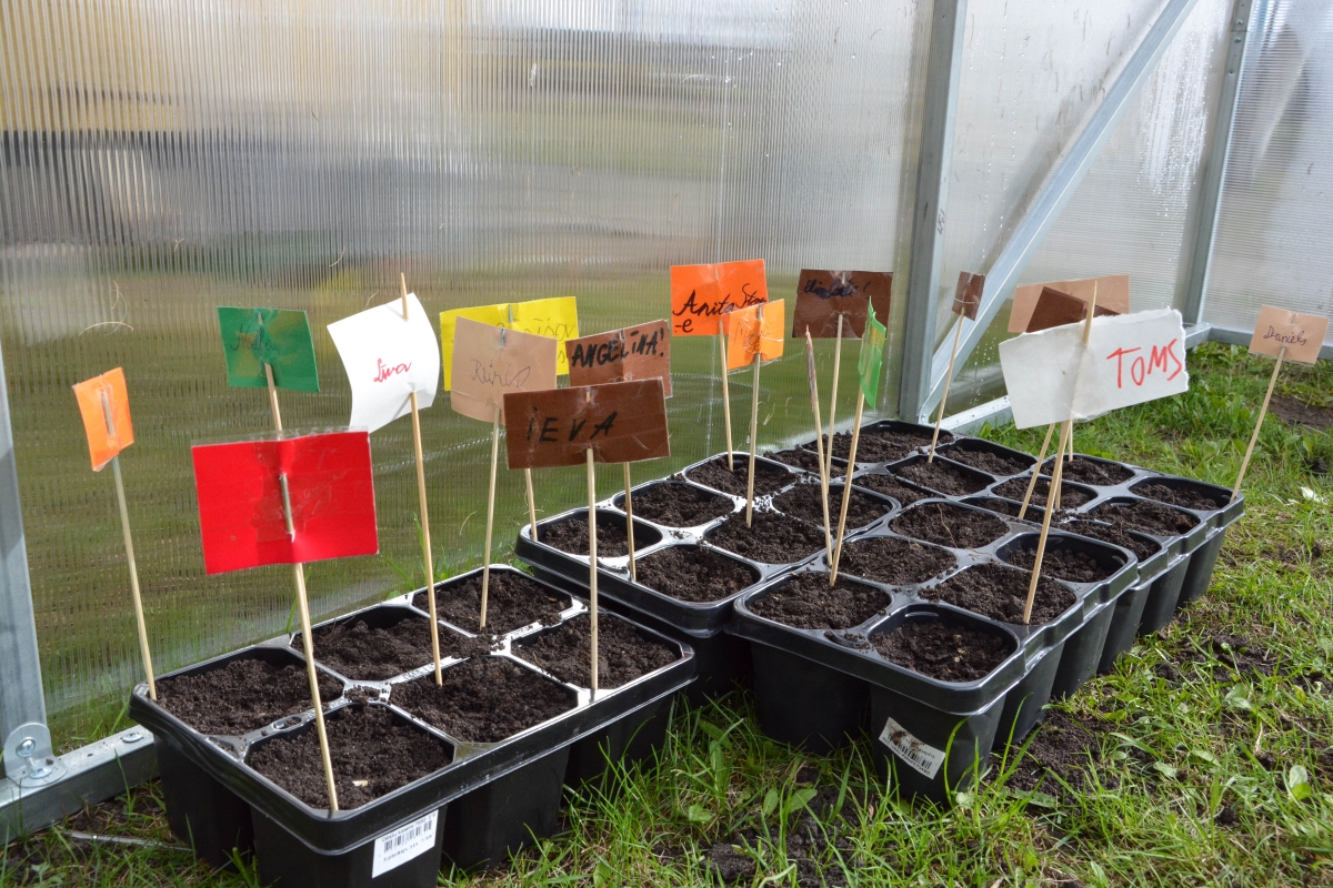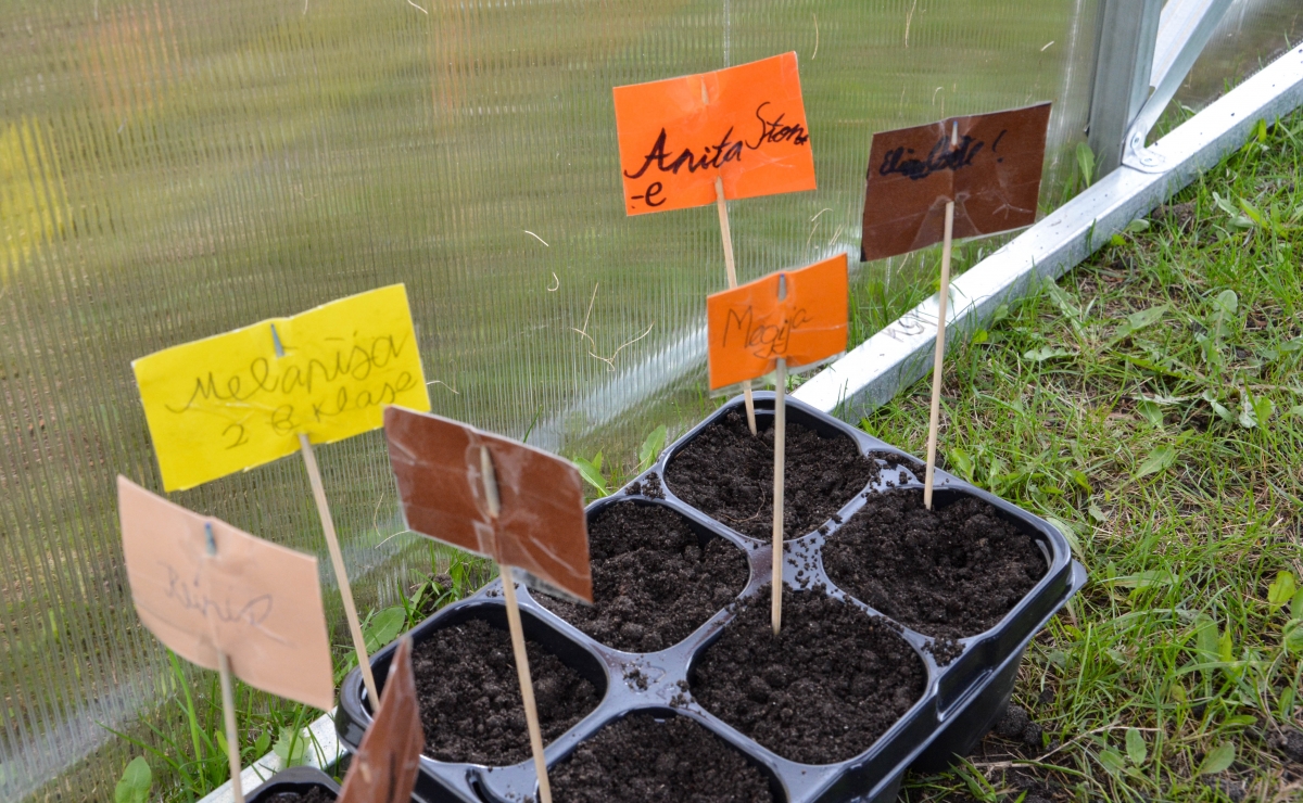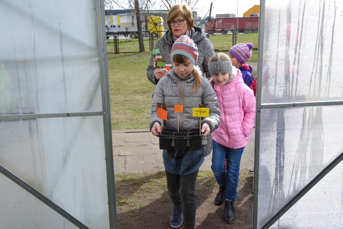 Ученики Центральной начальной школы сажают в теплице. ФОТО: Лига Руде.