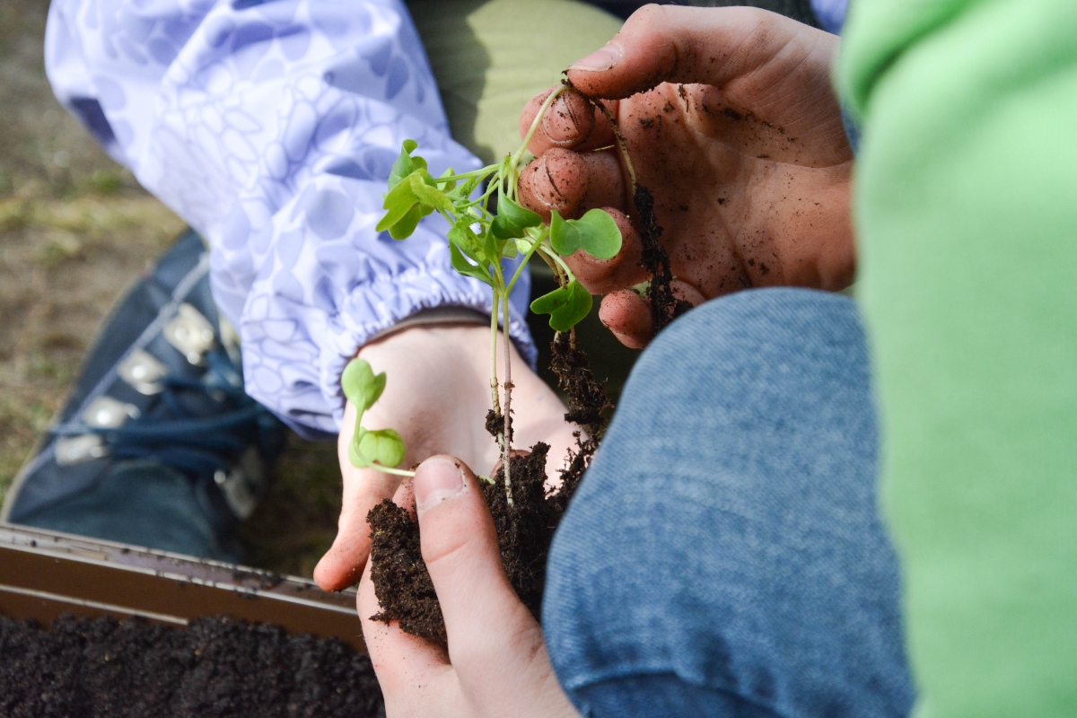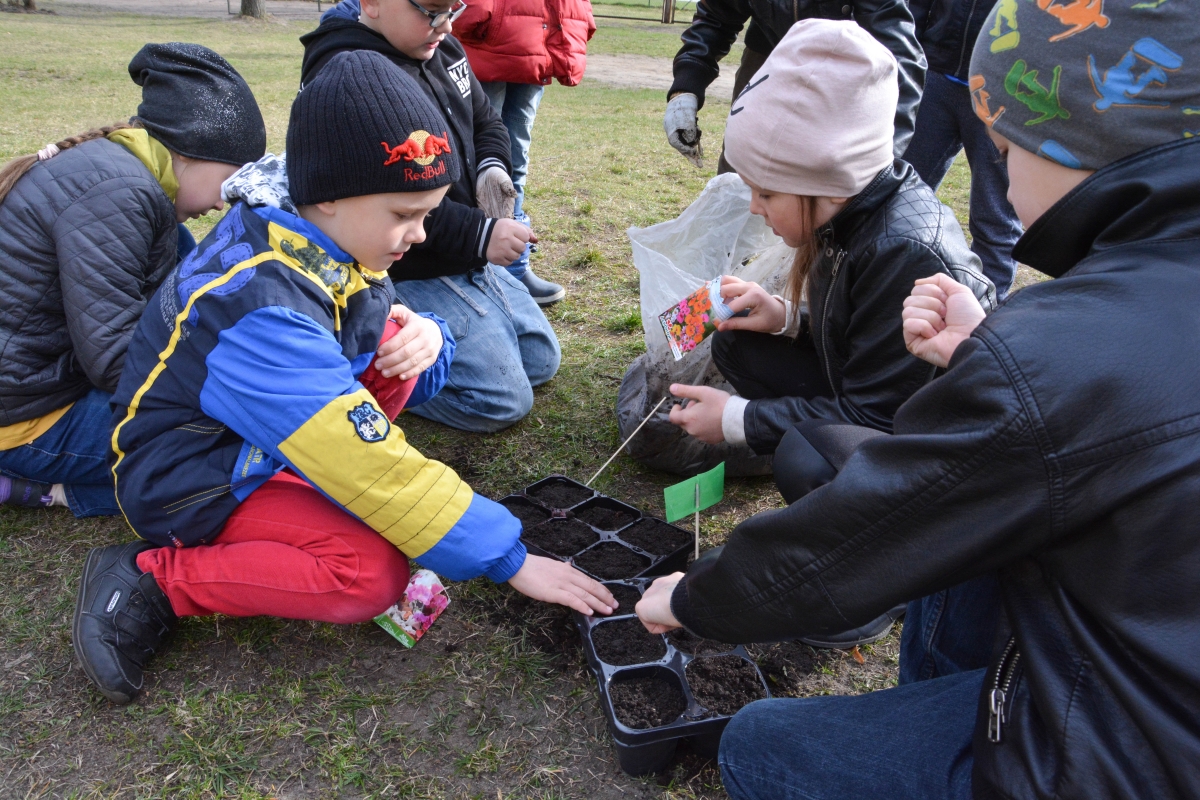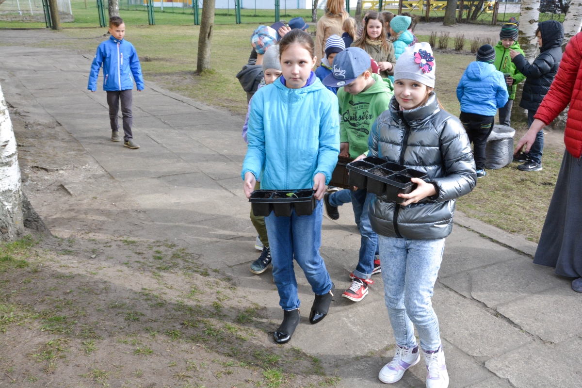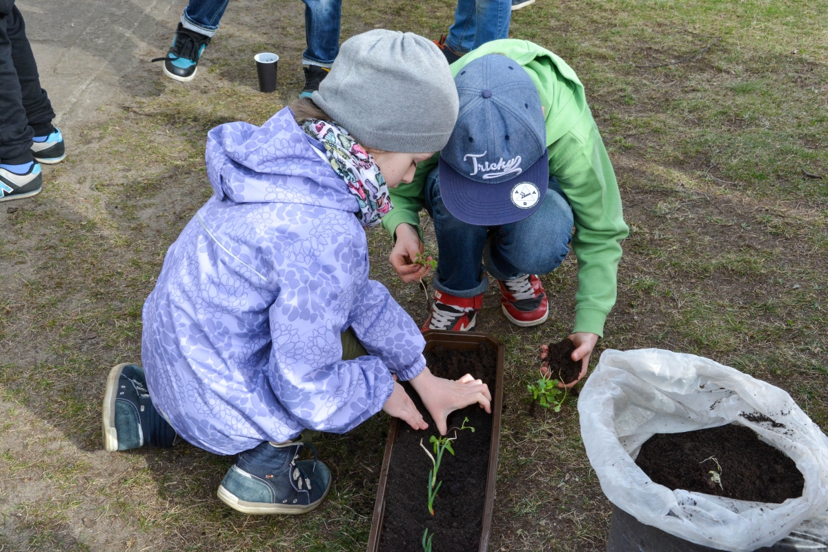 Ученики Центральной начальной школы сажают в теплице. ФОТО: Лига Руде.