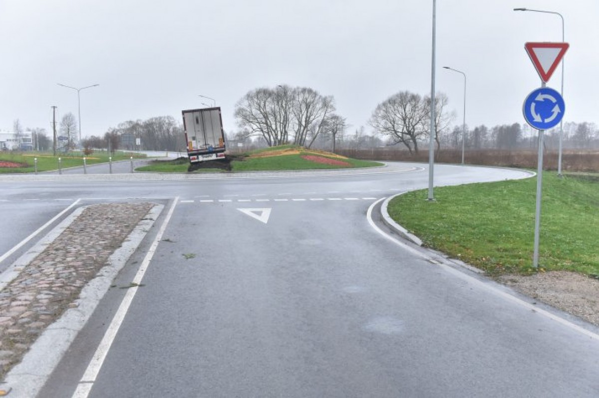 Во вторник, около 22 час. Госполиция получила вызов на ул. Курземес, где водитель грузовой машины въехал в клумбу на новом ротационном кольце.