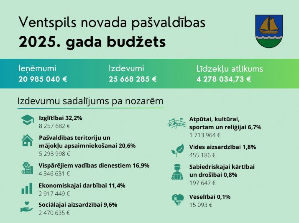 На заседании Вентспилсской краевой думы был утвержден бюджет самоуправления на 2025 год. Ожидается, что общий доход самоуправления Вентспилсского края в 2025 году составит 20,98 млн евро.