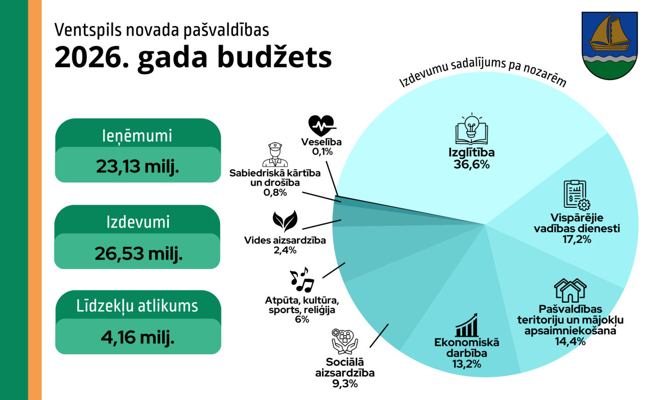На заседании думы Вентспилсского краевого самоуправления был утверждён бюджет на 2026 год. Планируется, что общие доходы муниципалитета составят 23,13 млн евро.