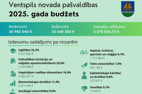 На заседании Вентспилсской краевой думы был утвержден бюджет самоуправления на 2025 год. Ожидается, что общий доход самоуправления Вентспилсского края в 2025 году составит 20,98 млн евро.