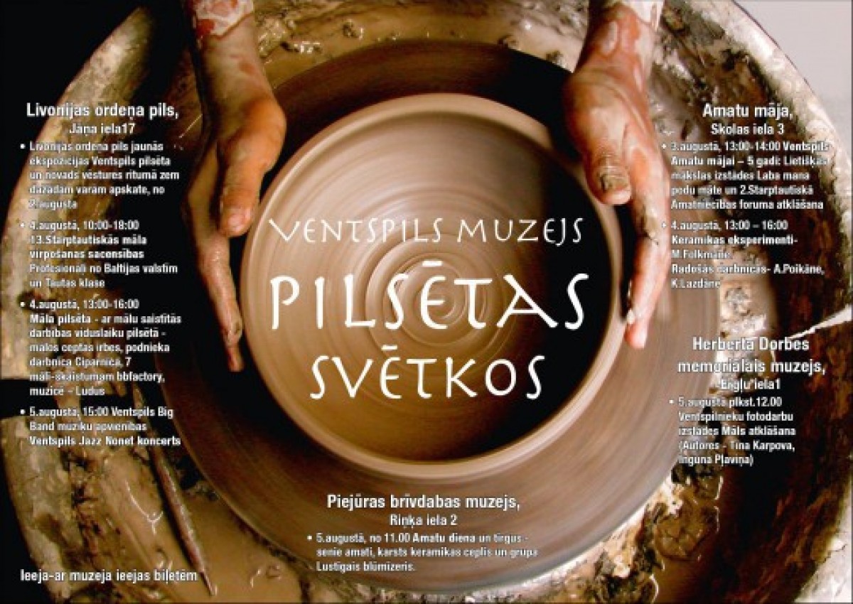 В вентспилсском Доме ремесел в пятницу, 3 августа, в 13:00 начнется мероприятие по случаю празднования приятного мгновения первой «пятилетки», и будет открыта выставка работ прикладного искусства «Laba mana podu māte», на которой в качестве экспонатов можно будет увидеть горшки различных видов со всех краев Латвии. 2-й международный ремесленный форум тоже пройдет 3 августа в Старом классе Дома ремесел.