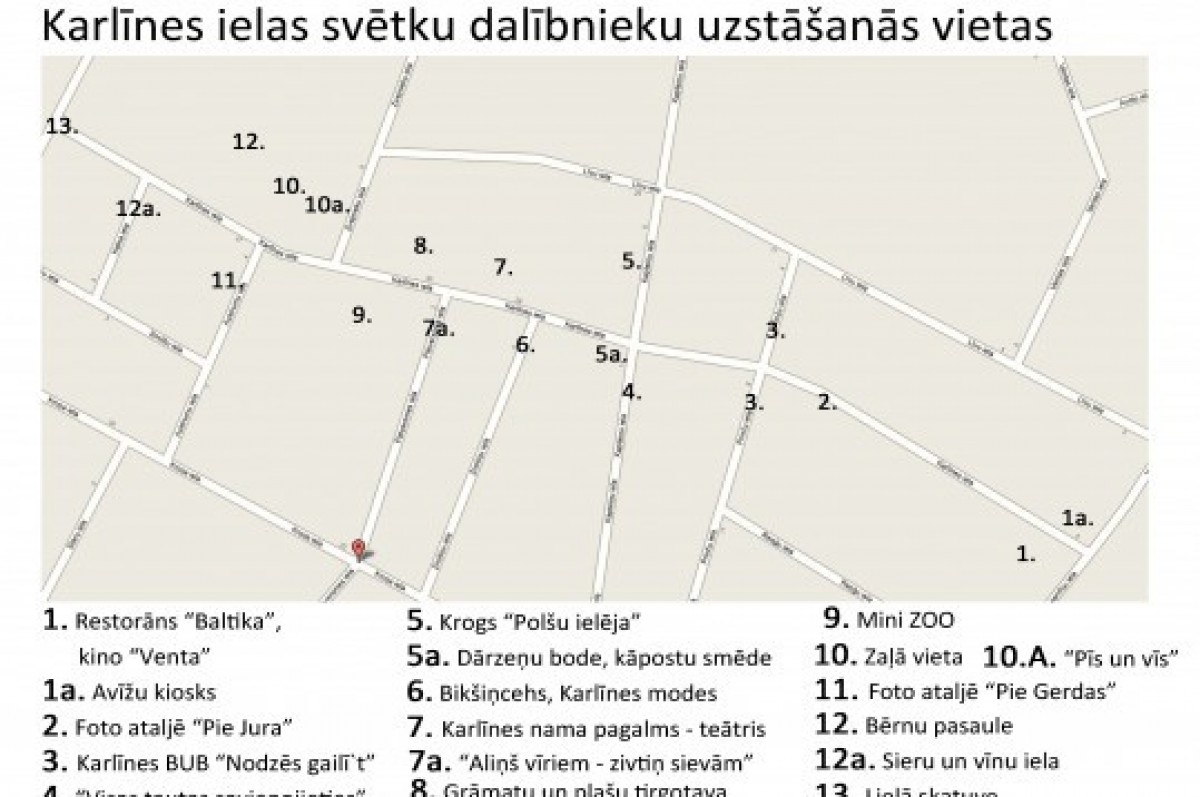 Также как и когда-то гостей праздника порадует кинотеатр «Вента», а насладиться атмосферой старого времени пригласит ресторан «Балтика». Облачиться в старинное одеяние предложит фотоателье, будет предоставлена возможность и проверить свои силы в различных дисциплинах на ловкость, и здесь же на улице присоединиться к франтам и принять участие в специальном показе мод улицы Карлинес. В газетном киоске можно будет купить праздничную газету с «самыми свежими» новостями.