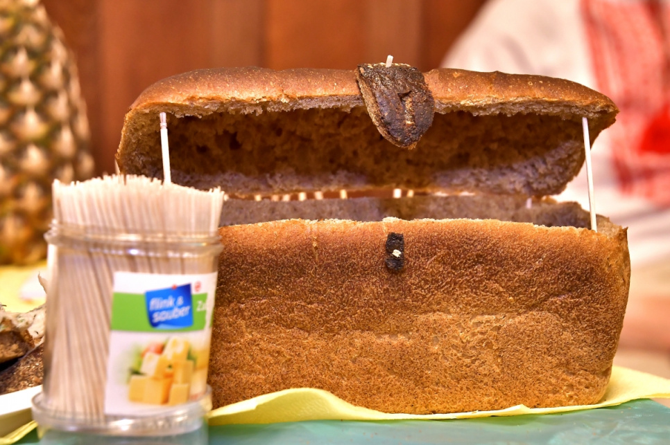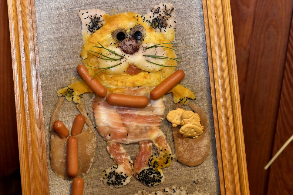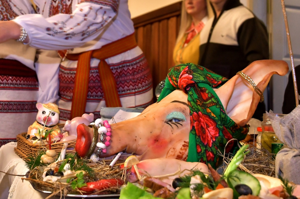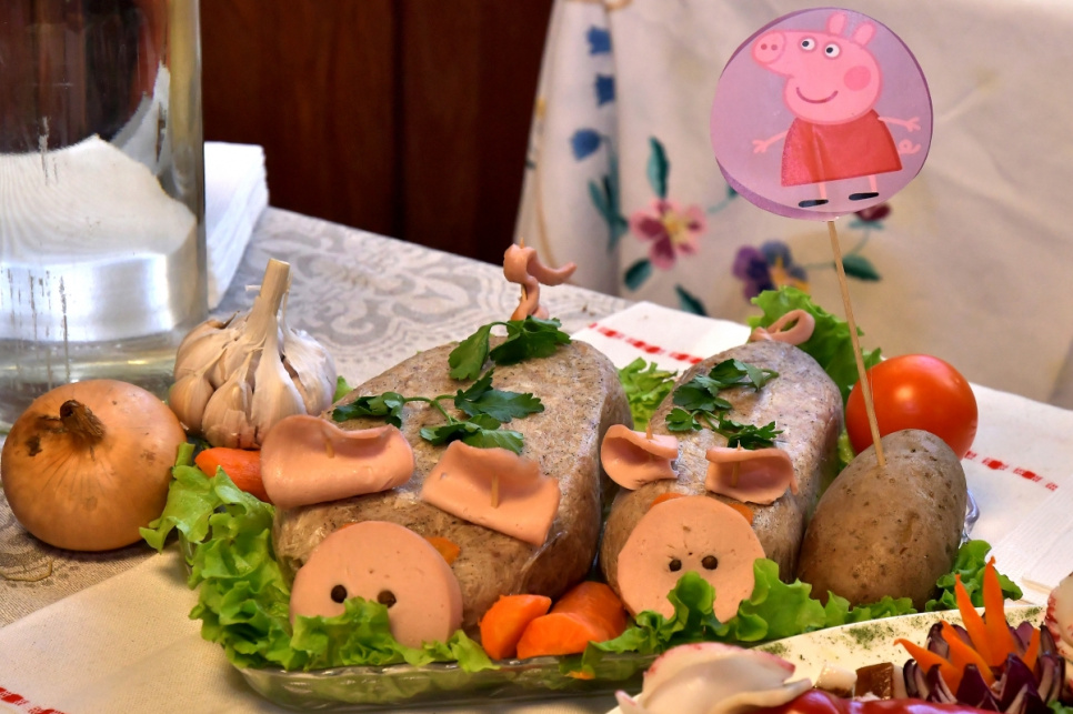 свинной голове накрасить глаза,из хлеба сделать шкатулку,кушать пазируя на фото,пить самогон,из продуктов делать поделки,даже дьявол бы до этого не додумался,