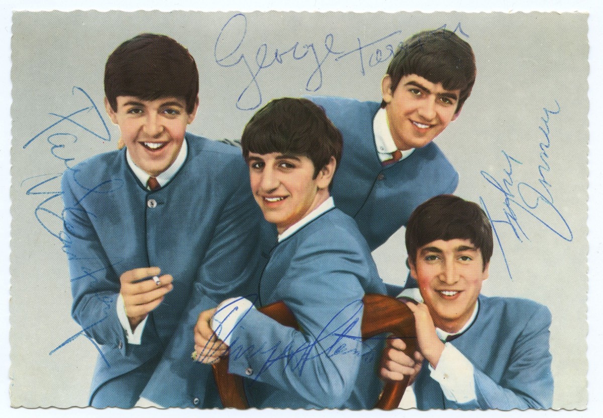 11 февраля 1963 года группа The Beatles записала свой первый альбом Please Please Me, но на этой почтовой открытке четверка изображена в костюмах во время записи своего дебютного сингла Love Me Do (1962).