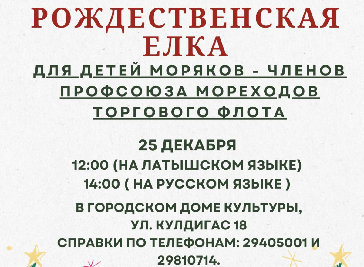25 декабря 2024 года в помещении Центра культуры пройдет елка для детей моряков, являющихся членами Латвийского профсоюза моряков торгового флота.