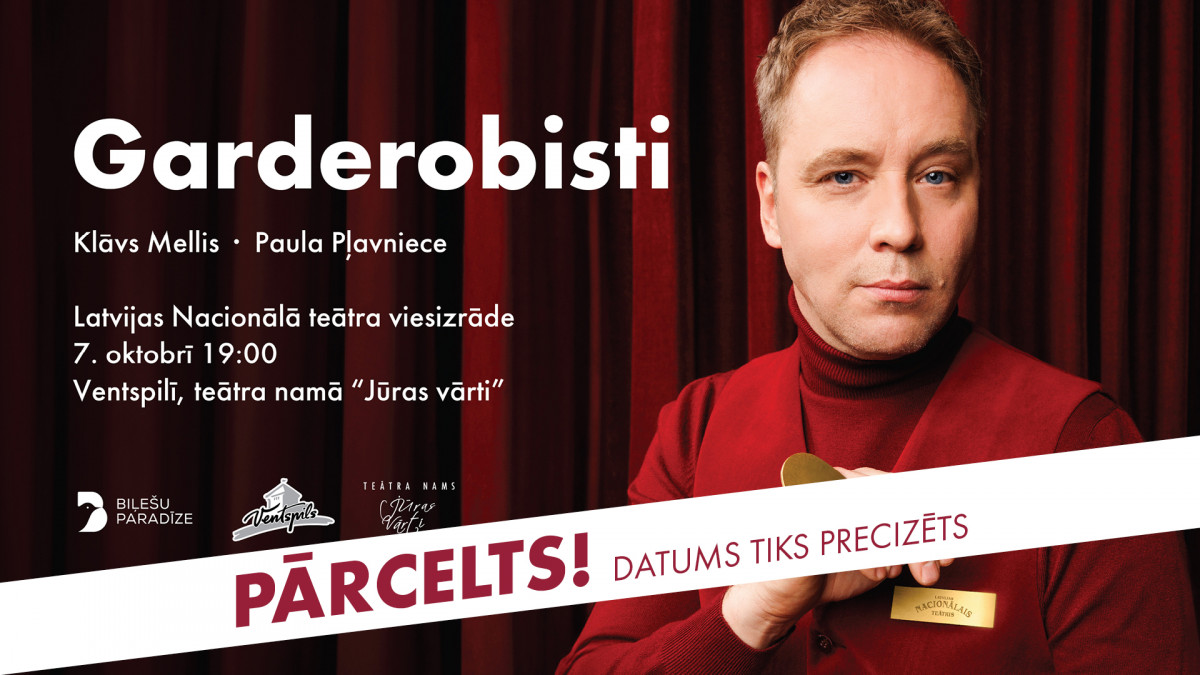 В связи с проблемами со здоровьем актёра переносится запланированный на вторник, 7 октября, спектакль Латвийского Национального театра «Garderobisti» в театральном доме «Jūras vārti». Новая дата гастролей будет объявлена отдельно.