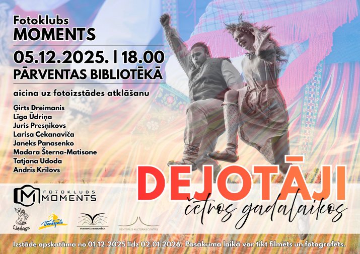 Вентспилсский фотоклуб «Moments» в сотрудничестве с молодёжным коллективом народного ансамбля танца «Liedags» Вентспилсского Центра культуры приглашает на открытие новой фотовыставки «Танцоры в четырёх сезонах», которое состоится 5 декабря 2025 года в 18:00 в Парвентской библиотеке.