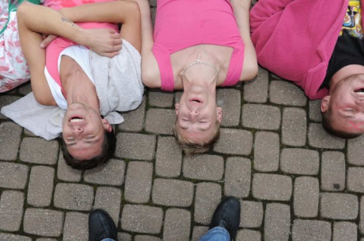Всего было около 90 человек, которые собрались на автостоянке Вентспилсского ВУЗа для проверки физической подготовки. Были такие задания, как танцы, бег, прыжки, приседания и др. Первокурсники были разбиты на команды по 10-12 человек, с предводителем со 2-ого курса.