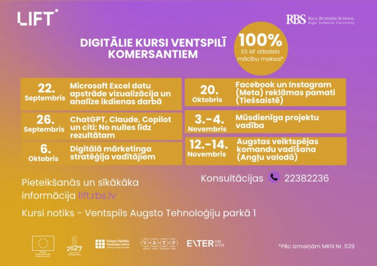 Открыт набор в открытые группы на цифровые обучения LIFT в Вентспилсе со 100% софинансированием платы за обучение из Фонда восстановления ЕС.