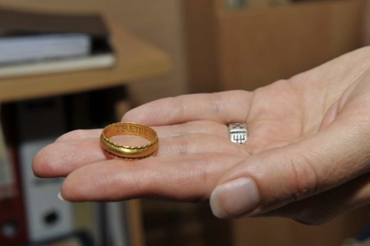 Можно предположить, что это обручальное кольцо, но тогда должна была бы иметься и гравировка имени возлюбленного. В те времена в Европе уже существовала традиция обмениваться золотыми кольцами при бракосочетании, и кольца походили на современные.