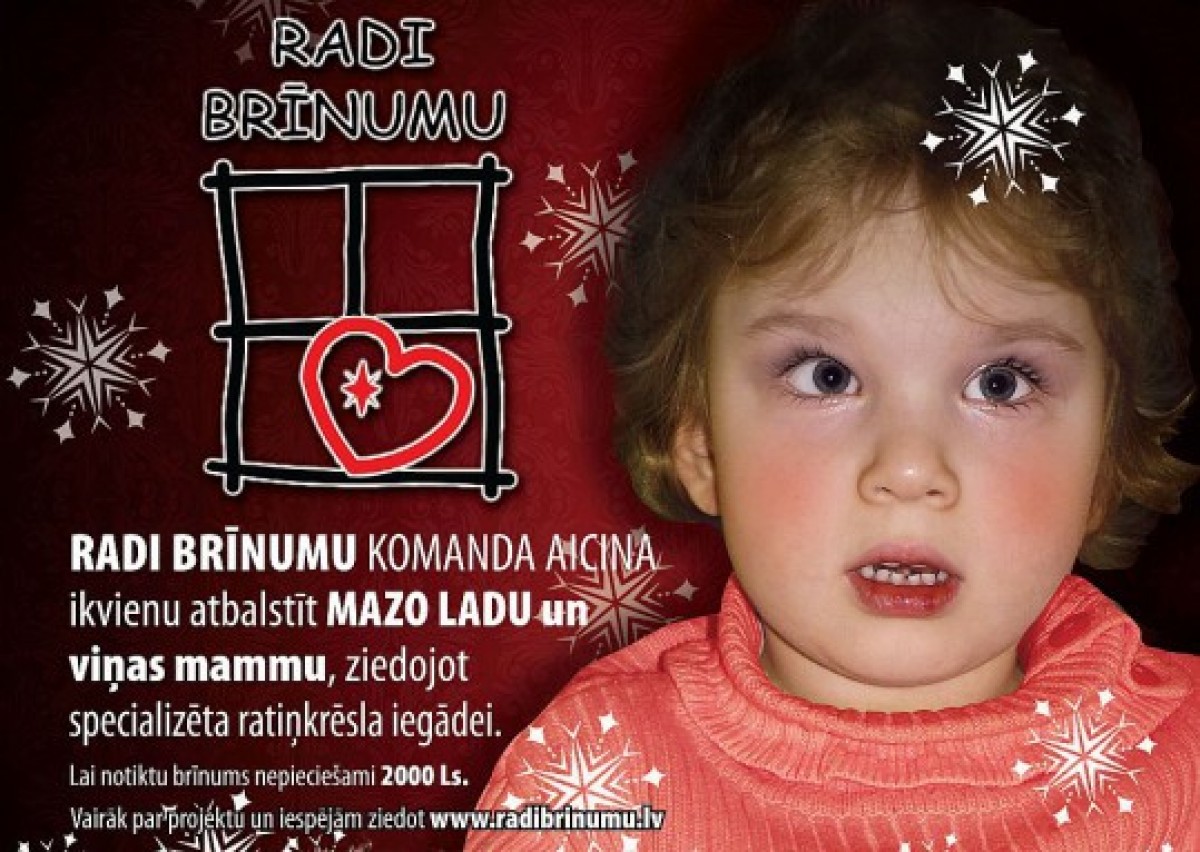 Чтобы поставить малышку на ноги требуется большая денежная сумма, которой, к сожалению, у мамы Лады нет, поскольку она одна содержит всю семью. Девочке нужно стабилизировать позвоночник, осанку и другие группы мускулатуры. Ей требуется специальная кресло-каталка Stingray. Чтобы обеспечить Ладе реабилитационный курс и специальное кресло-каталку требуется 3467 латов.