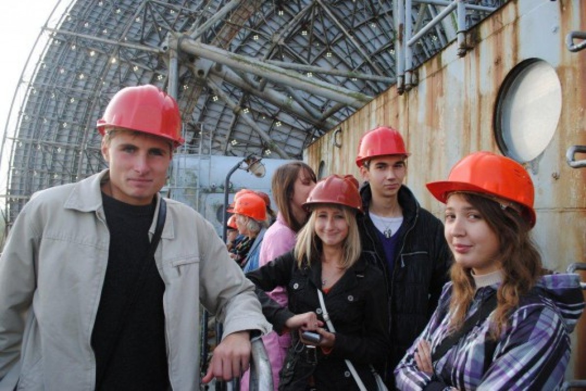 Мы разделились на группы. Первая группа, в числе которой была и я, решила начать экскурсию сверху – прежде всего, взобраться на сам локатор. Всю опасность нашего решения мы осознали, когда нам велели надеть каски. В касках все выглядели испуганными и смешными. Мы поднялись на второй этаж, где нас познакомили с локатором, который экскурсовод ласково называла РТ-32. Как выяснилось, 32 – это диаметр диска, а его вес – не много ни мало, 600 тонн!