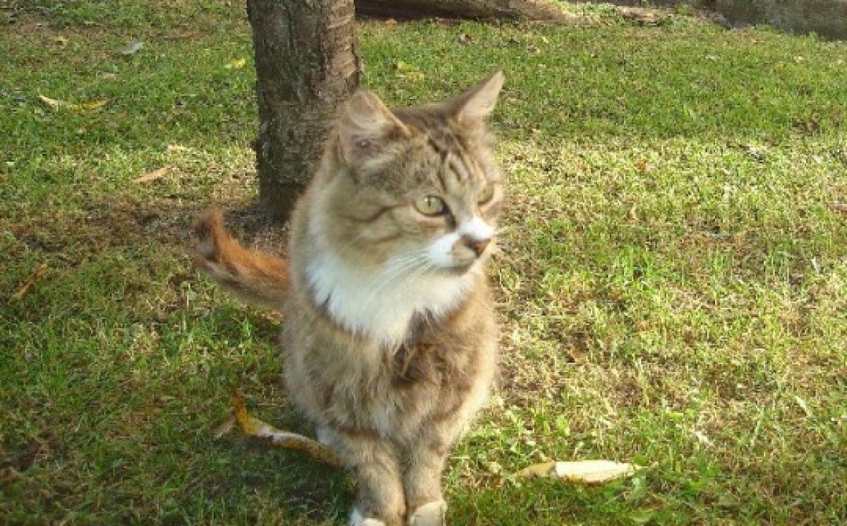 На просп. Лиелайс во дворе домов №№ 29 и 27 в домике около дерева живут кошка и взрослый котенок.