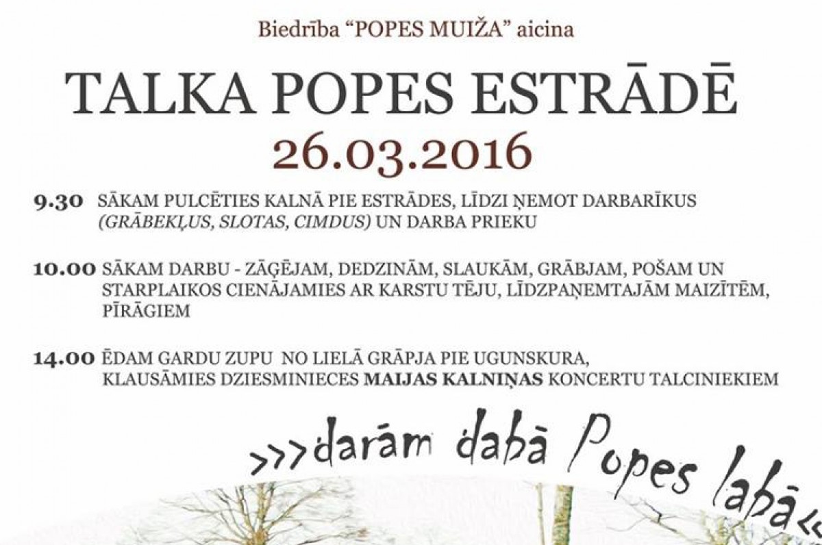 Сбор – в 9:30. При себе надо иметь рабочие инструменты, в т. ч. грабли, мётлы и перчатки. В 10 час. – начало субботника, в 14 час. – общий обед и концерт лиепайской певицы Майи Калныни. Субботник организует общество Попес муйжа.