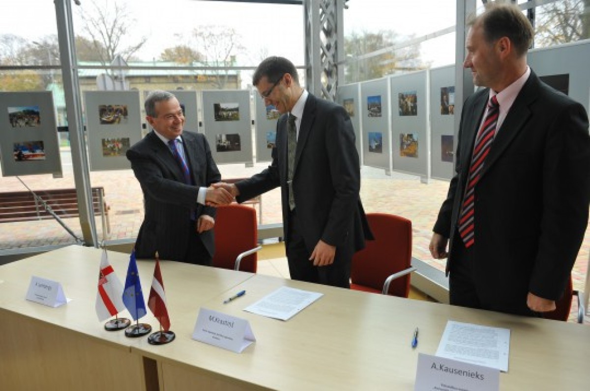 Фото: Директор Государственного агентства регионального развития Марис Крастиньш (посередине) и директор Коммунального управления Андрис Каусениекс в присутствии мэра города Айвара Лемберга подписывают договор.