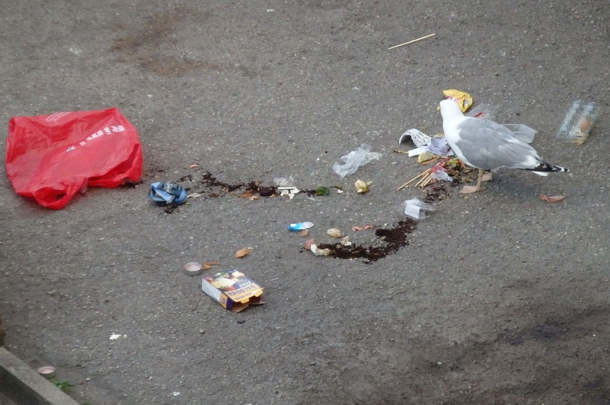 Жительница рассказывает, что оставленные у контейнера пакеты разрывают чайки и другие птицы, а вид во дворе — как на свалке. И такая картина из окна этой женщины открывается через каждые три дня.