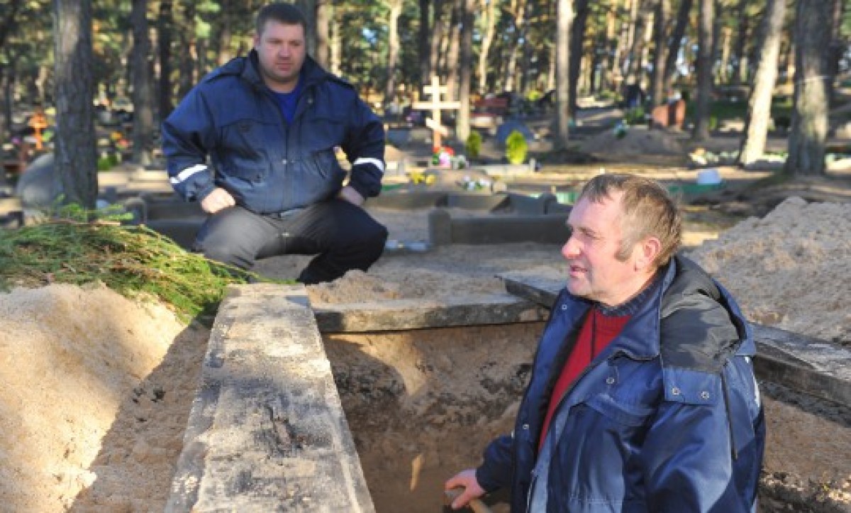 Марис и Раймондс иногда подрабатывают и носильщиками гробов; если вместе с гробом человек весит до 100 кг, то его несут четверо мужчин, а если больше – 6 человек. Закончив работу, сотрудники Комбината благоустройства сначала кланяются усопшему и только после этого уходят.