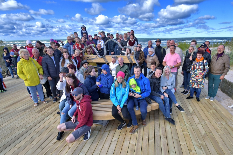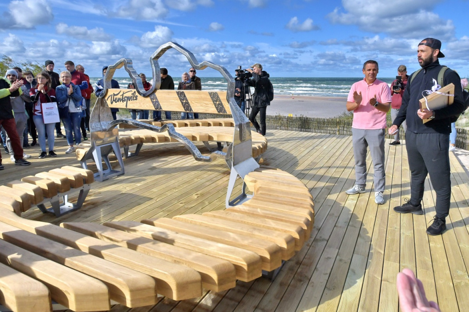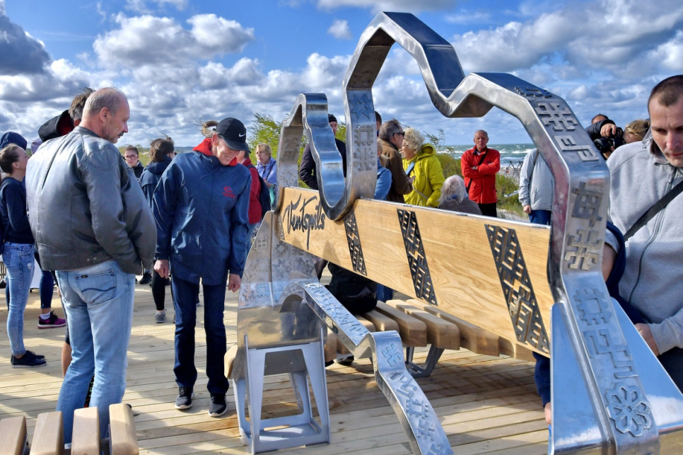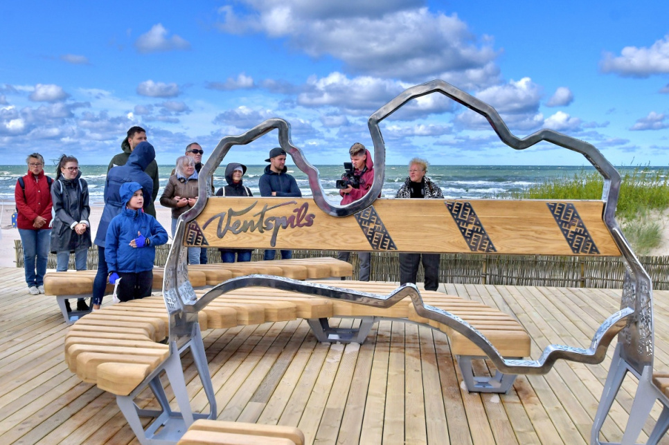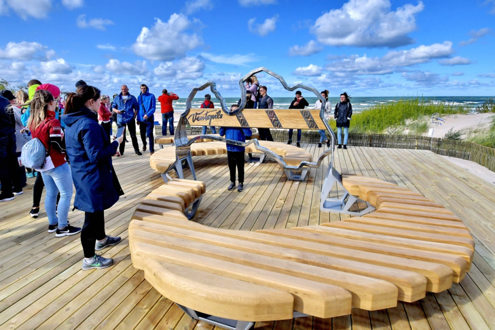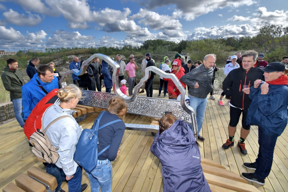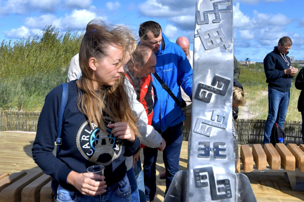 В субботу, на вершине самой высокой дюны у 5-й дорожки открыли новый объект смотра. Это подарок от ООО Bucher Municipal Вентспилсу в честь столетия Латвии.