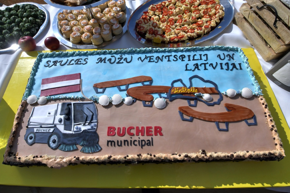 Коллектив ООО Bucher Municipal вручил Вентспилсу уникальный подарок – вертикальный контур Латвии на платформе, скамейки и дорожку, ведущую к этой платформе.