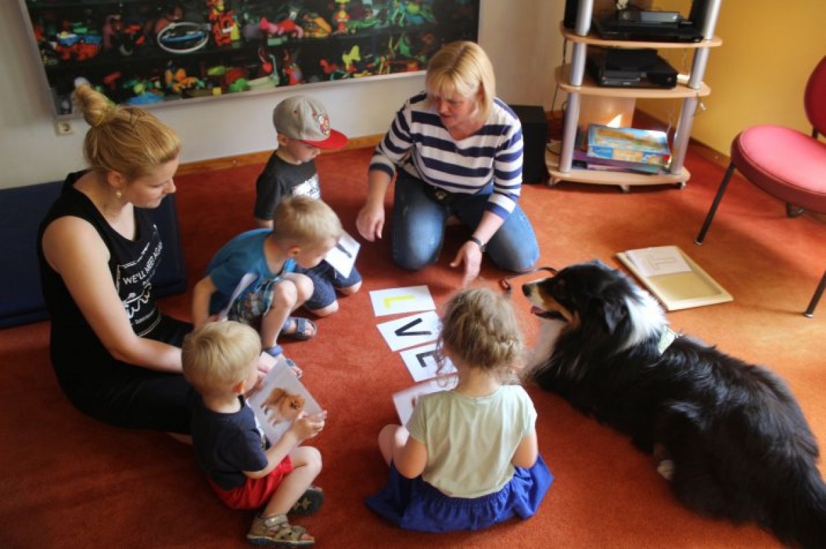 Занятия по канистерапии в Детской библиотеке проходят раз в месяц, на них участники изучают буквы, цифры, цвета, Латвию и другие страны.