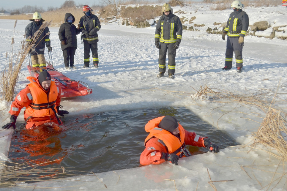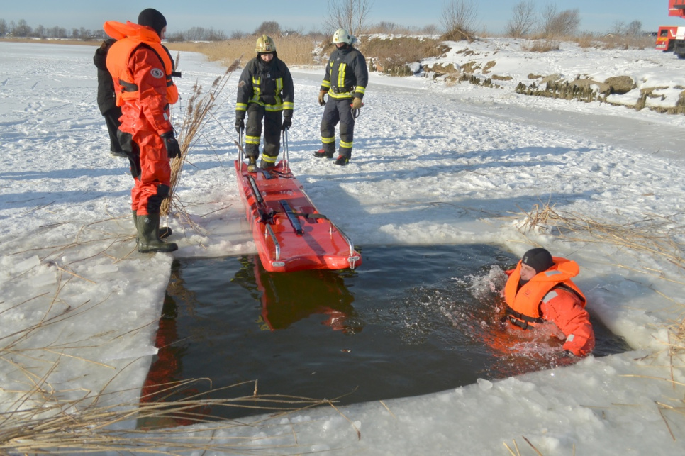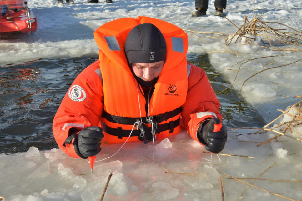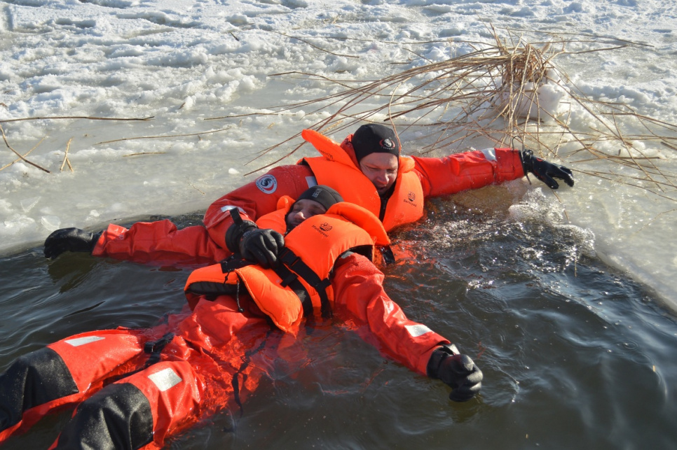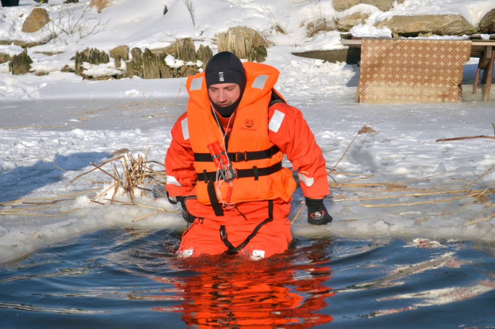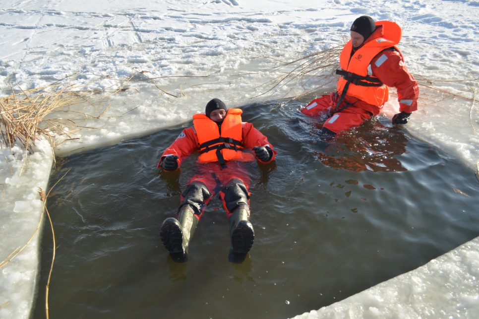Холодный зимний день спасатели использовали, чтобы усовершенствовать свои навыки в спасении провалившегося под лет человека и использовании необходимого инвентаря.