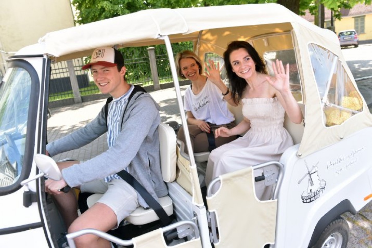 Впервые мы заметили удивительное транспортное средство на Ратушной площади. Как маленький бежевый слоник, оно стояло рядом с церковью и украдкой было сфотографировано на память. Оказалось, нас пленил тук-тук – популярное туристическое средство передвижения во всём мире. В этом году тук-туки радуют также жителей и гостей Вентспилса. Мы решили, что такой автомобиль прекрасно подходит для развлечения в солнечный день, и отправились в приключение.