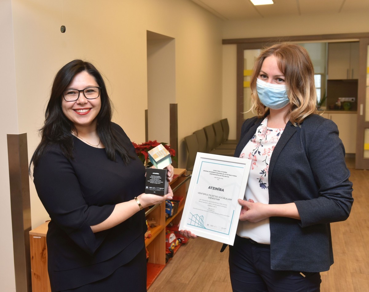 Во вторник вентспилсской Социальной службе была вручена почётная награда за новое здание для Цимдиньша. «Министерство благосостояния совместно с организацией сотрудничества с людьми с особыми нуждами SUSTENTO обследовала объекты, осуществляемые при помощи Европейского социального фонда, и по определённым критериям отобрала 15 лидеров, одним из которых стала вентспилсская Социальная служба, и мы от лица Министерства благосостояния вручаем эту награду», – поясняет представительница издательства Диенас Медии Санта Бутане. Одним из главных критерием оценки стали решения, обеспечивающие доступность среды.