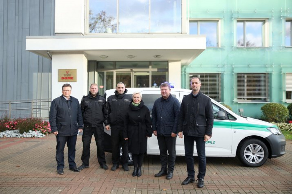 В связи с 30-летием вентспилсской Полиции самоуправления заместитель председателя думы самоуправления города государственного значения Вентспилса Айго Гутманис торжественно вручил ключи от нового патрульного автомобиля VW CADDY.