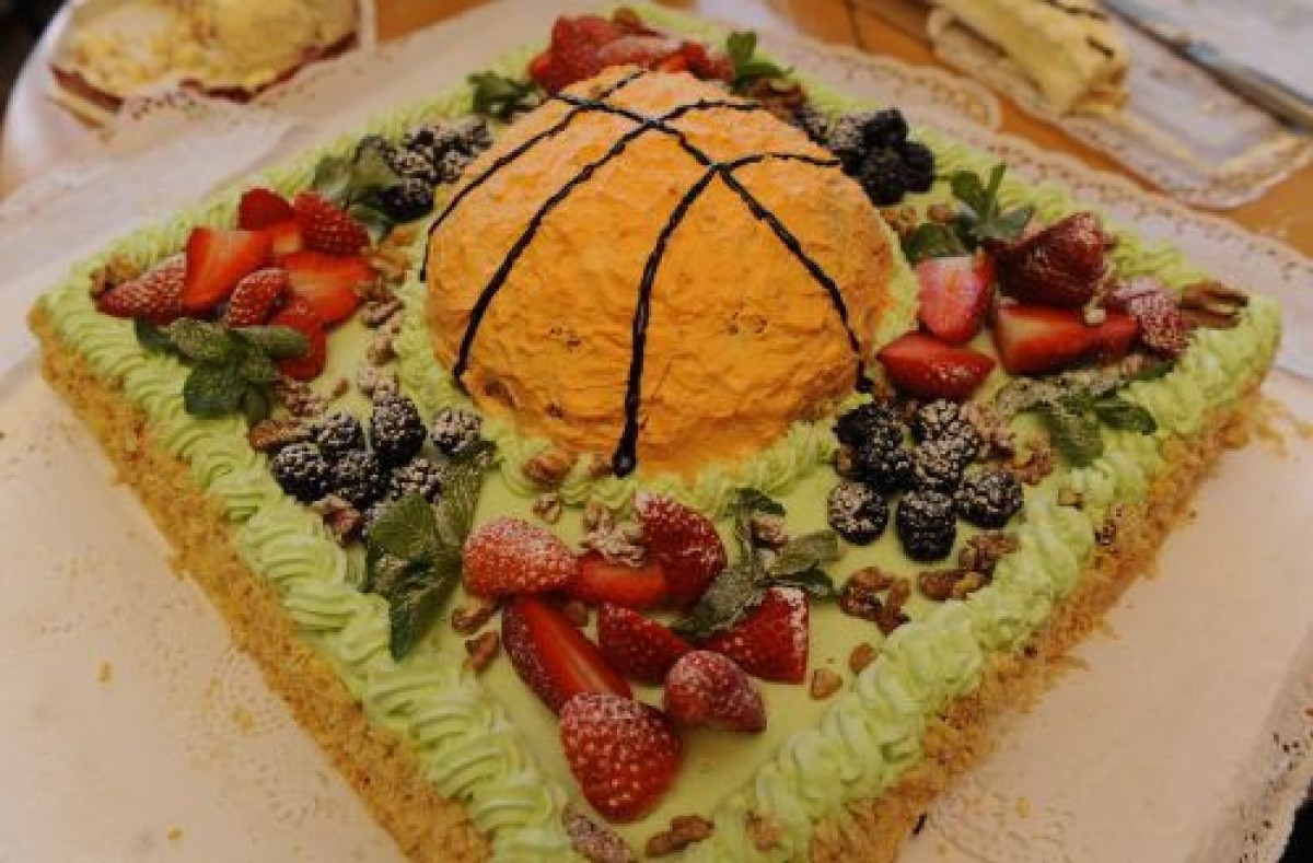 Раз пришел праздник, то без торта не обойтись. Однако баскетболисты пошли дальше и подарили торт в виде баскетбольного мяча. Поздравить работников редакции пришли капитан команды Акселис Вайрогс и маркетинговый специалист Солвита Плейница.