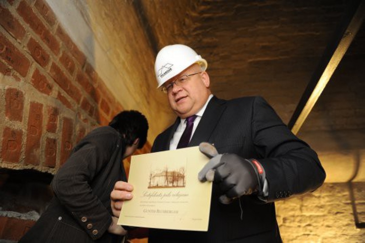 В закладке кирпичей принимали участие руководство думы, авторы проекта, строители и др. Первым к работе приступил мэр города Айварс Лембергс, который в шутку сказал, что показывает строителям верное направление. Он пожелал рабочим уложиться в сроки, а главное – обеспечить высокое качество, поскольку второй этаж замка будет самым интересным и представительным.