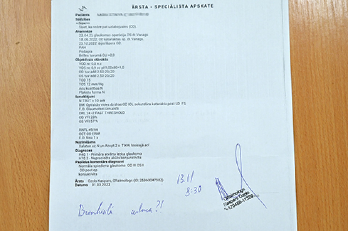 Однако, раз уж врач написал нечто подобное, Мара (по её словам – шутки ради) сходила к семейному врачу, который направил её к пульмонологу. Ждать приёма пришлось три месяца. «7 июня я попала к д-ру Густу Анцану, который направил меня на компьютерную томографию грудной клетки. Пришлось опять ждать, и 10 августа я получила описание обследования. Прочитав его, была шокирована, потому что там было чётко написано, что нужно срочно обращаться к торакальному хирургу, ведь в левом лёгком образование – злокачественная опухоль. Если бы д-р Озолс не высказал предположение о бронхиальной астме, если бы не его инициатива, не знаю, чем бы всё закончилось», – продолжает Мара. По направлению пульмонолога вентспилсчанка получила медицинские услуги по так называемому зелёному коридору, вне очереди. 5 октября прошла операция, после которой Мара чувствует себя хорошо. Поскольку диагноз был поставлен вовремя, никаких других медицинских манипуляций не требуется. Женщина до сих пор не понимает, как окулист мог заметить нечто подобное. Когда спросила у самого врача, получила довольно простой ответ: «У меня несколько более широкий взгляд на медицину».