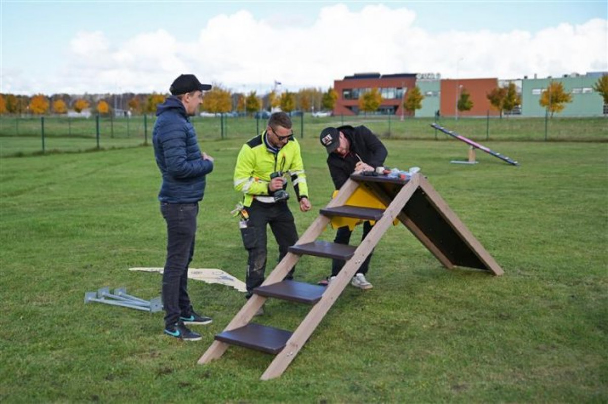 На улице Риндас обустраивается площадка для выгула собак с тренировочными элементами, изготовленными и монтируемыми компанией ООО “Jūrmalas Mežaparki”.