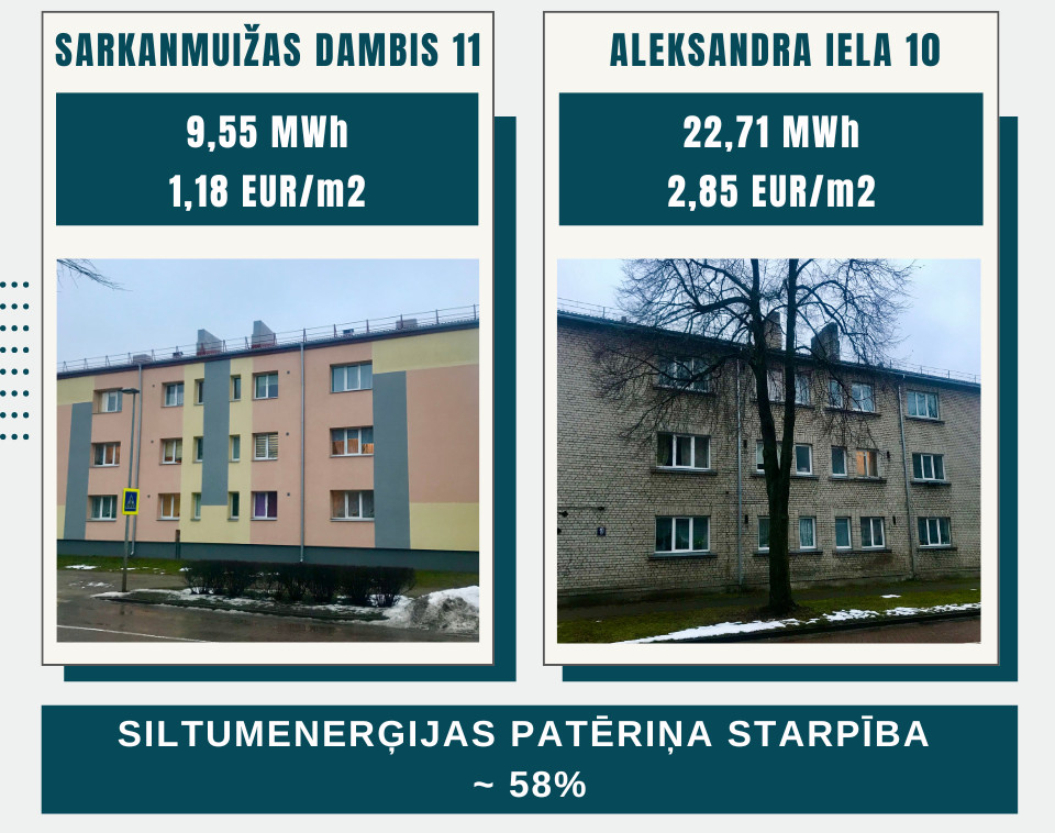Если же сравнить потребление тепла в этих домах в феврале 2018 года, когда средняя температура воздуха была –4°C и дом на Сарканмуйжас дамбис, 11 ещё не был реновирован, разница в потреблении тепла между домами составляла около 6%.