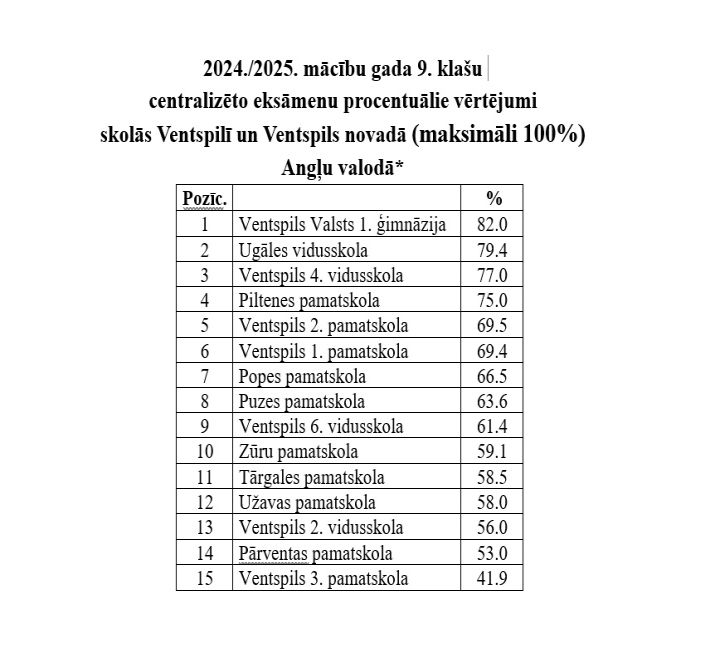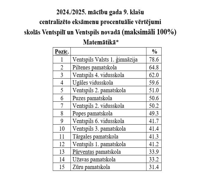Результат по математике в прошлом году самый высокий был в гимназии (79%), на втором месте — Пилтенская основная школа! У них, скажу прямо, отличный результат — 65%. И затем идёт Вентспилсская 4-я средняя школа с 62%. Что важно знать родителям: если оценка на централизованных экзаменах в школе выше 60% — это хороший уровень, и это качественное образование. Конечно, в среднем. Ещё следовало бы оценивать каждый класс и каждого педагога отдельно — чего он добился со своими учениками.