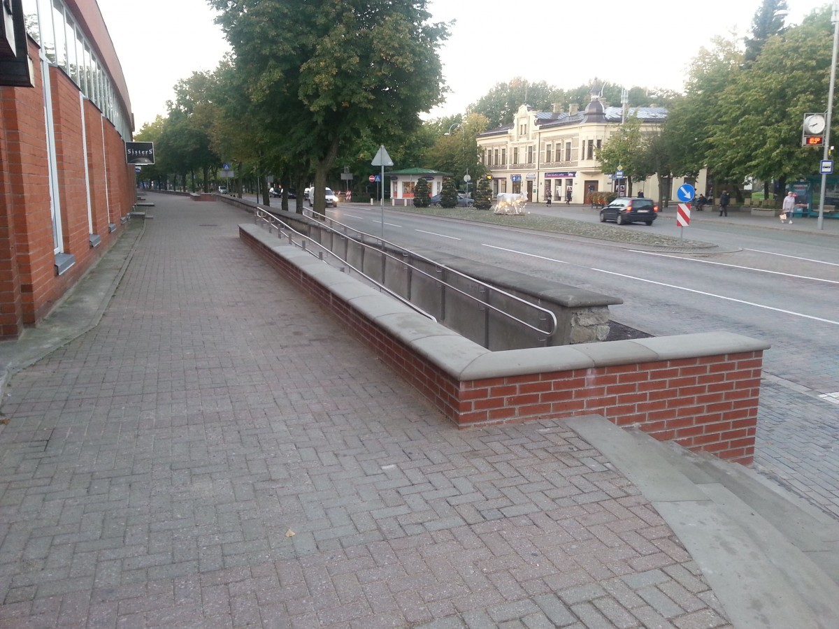 Помимо пандусов, у этого здания построили новые ступеньки, а на отрезке ул. Райня построили опорную стену. Новые пандусы появились на ул. Кулдигас, на съезде у банка Swedbank, напротив киоска ООО Narvesen Baltija, а также напротив магазина Drogas, на перекрестке ул. Юрас, где пандусов теперь два – в сторону ул. Райня и Кулдигас. Также установлены перила и тактильные полосы.