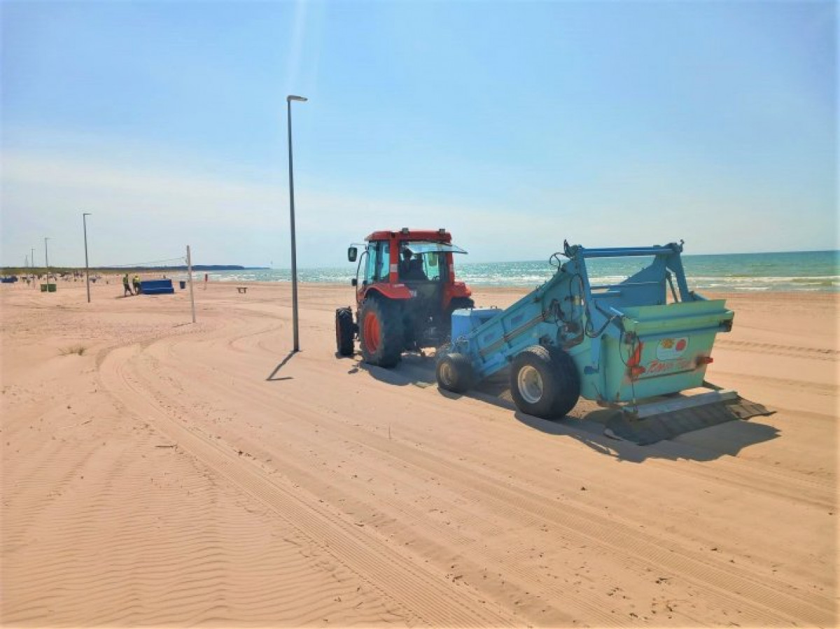 Для очистки берега пляжа используется трактор с просеивателем, который поднимает наверх слой песка глубиной примерно 15 см и просеивает его. В процессе отходы и галька разных размеров попадают в отдельную емкость, а чистый песок выбрасывается обратно на пляж. Собранная галька используется здесь же, на пляже – ее подсыпают к основаниям кабинок для переодевания, чтобы входы не засыпало песком во время ветра, а также в те места, где регулярно образуются выдувания песка. Процесс просеивания также помогает ограничить развитие неблагоприятных бактерий.