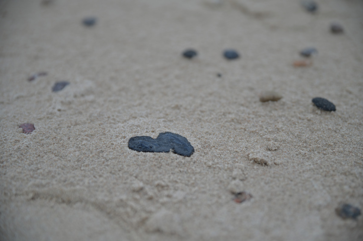 На берег вымыло множество сравнительно небольших капель нефтепродуктов. Они смешались с песком и прилипли к гальке, поэтому отличить загрязнение от камней на данный момент сложно – разницу можно почувствовать, лишь взяв гальку в руки. Зилниеце считает, что вымытое вещество не является мазутом, поскольку его было относительно легко смыть с рук и обуви.
