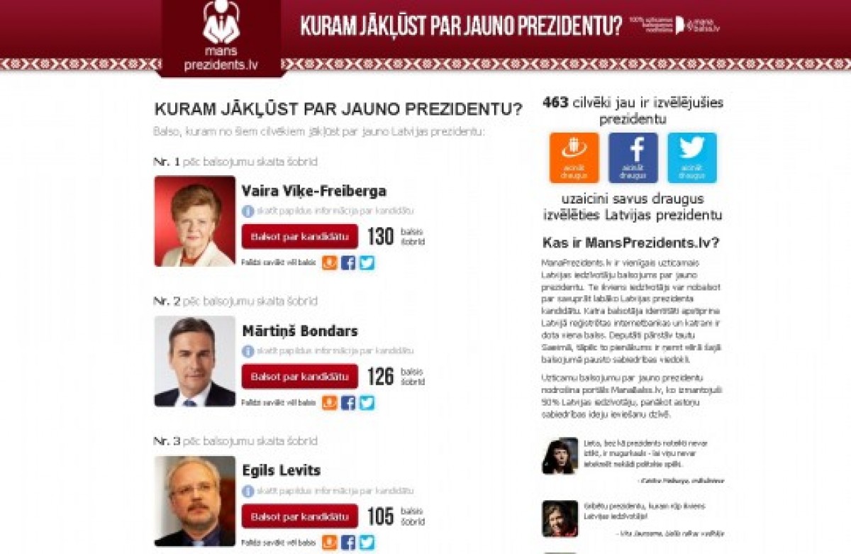С 20 апреля на портале можно проголосовать за одну из пяти кандидатур, получивших наибольшую поддержку в первом туре, а всего жителями Латвии было названо 130 кандидатов в президенты - спортсмены, журналисты, литераторы, политики и др.