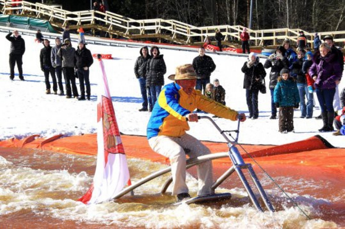Кульминацией мероприятия стал спуск на собственноручно изготовленных средствах передвижения через водный бассейн. В данной дисциплине свой транспорт продемонстрировал и патрон горы Айварс Лембергс, который также стартовал в заезде. Победители данной дисциплины были награждены в следующих номинациях: самые большие брызги, самое внушительное падение, самое интересное средство передвижения, самый маленький гонщик, самая активная семья и самый голый гонщик.