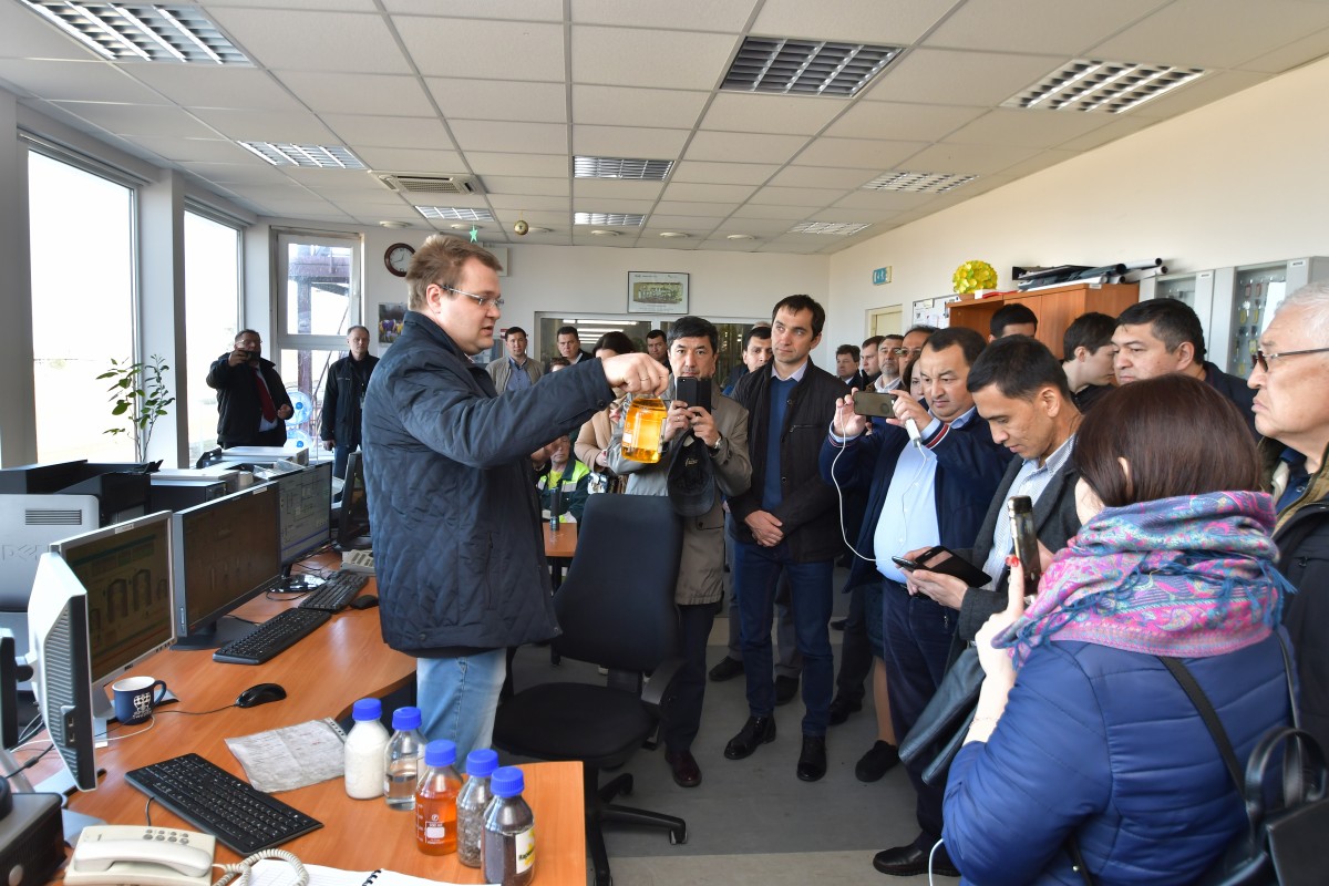Делегация представителей предприятий стран Центральной Азии посетила также терминал по перевалке наливных грузов Baltic Juice Terminal. Он принадлежит ООО Overseas Estates, а подробнее о терминале гостям рассказал представитель компании Гирт Фишер (первый справа).