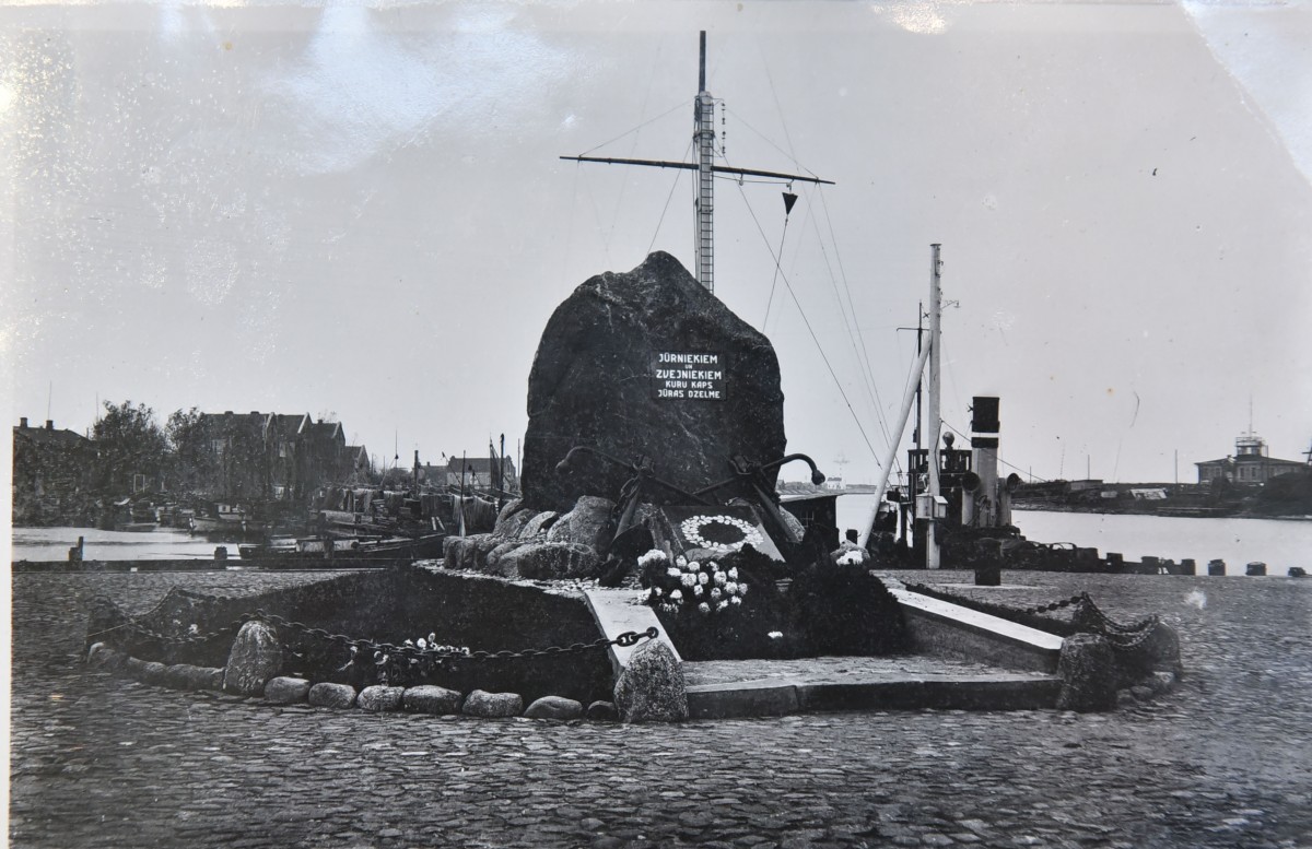 Памятник морякам и рыбакам, покоящимся в морской пучине. На заднем плане – не сохранившееся до наших дней здание правления Вентспилсского порта, а справа можно разглядеть урну для сбора пожертвований (конец 30-х, начало 40-х годов).
