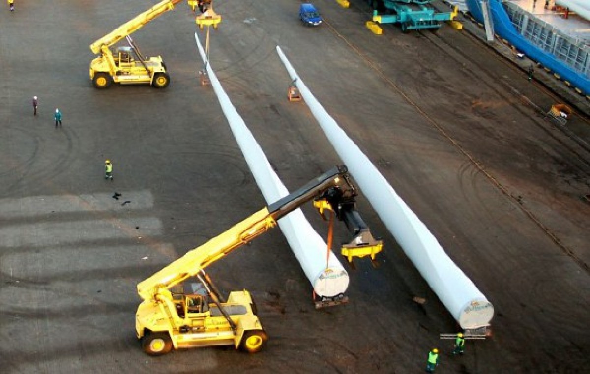 Длинные лопасти, которые являются нестандартным, крупногабаритным грузом, поступают в порт из Дании. Их принимают на NNVT, а затем, ночью, транспортируют в Платене, где строится парк ветряных генераторов. Зав. коммерческим отделом NNVT Артис Шенкевиц рассказывает, что на данный момент в порт поступила лишь часть компонентов ветряных генераторов, в т.ч. 16 лопастей. В общей сложности из Дании будут транспортированы 9 генераторов, то есть, 27 лопастей длиной в 50 метров. Для терминала это уникальное событие, поскольку, «хоть принимать осторожно и с большой ответственностью нужно любой груз, компания Siemens – владелец груза – выдвинула очень высокие требования к приему и хранению. Наш терминал готовился к этому грузу почти год, а последний месяц ‒ особенно интенсивно. Для нас это своего рода экзамен».